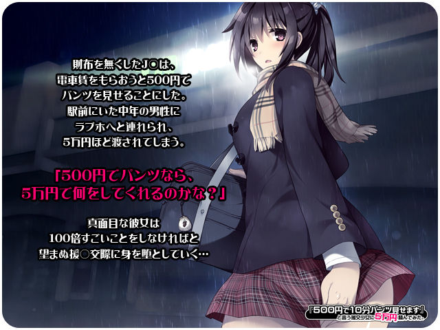 道に500円玉が落ちていたのをおもむろに拾おうとすると落とし主の男性がすぐ横に居て仕方なく返そうとするも家に帰りたい為に500円で10分パンツを見せるという援助交際を申し込む所から始まります。