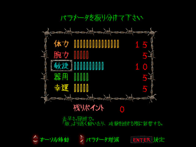 システムは自分で最初にパラメーターを振り分けてキャラメイクが出来るので体力の多いキャラや器用なキャラが作れます。