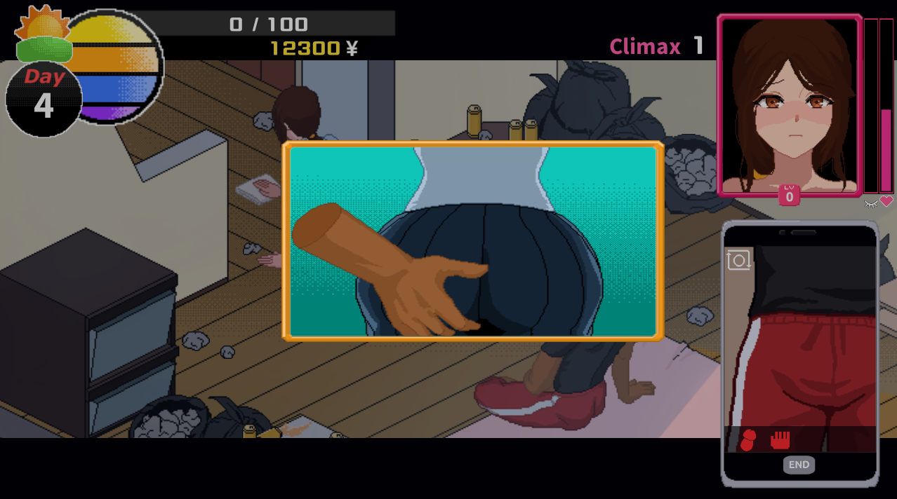 このいたずらの仕方が最初はイマイチ分からなかったのですが自分のズボンの下にあるアイコンで自分の一物をしごいたりして奥様のハートのゲージを上げていきます。