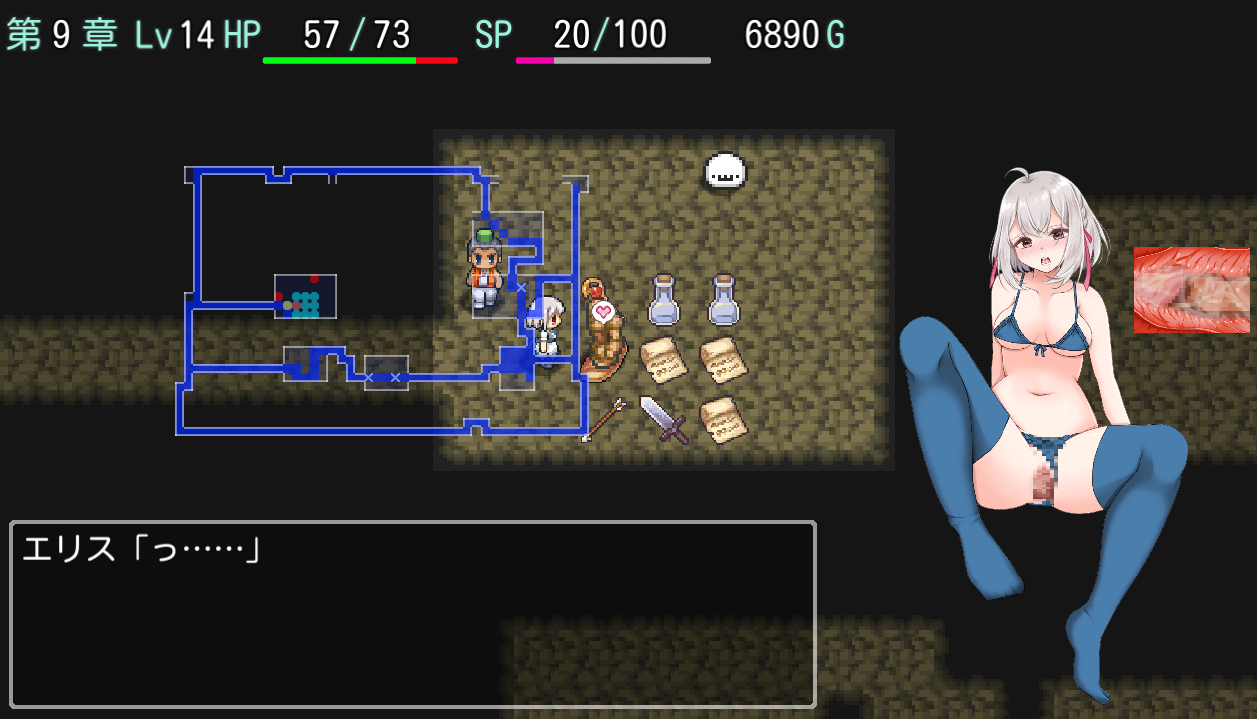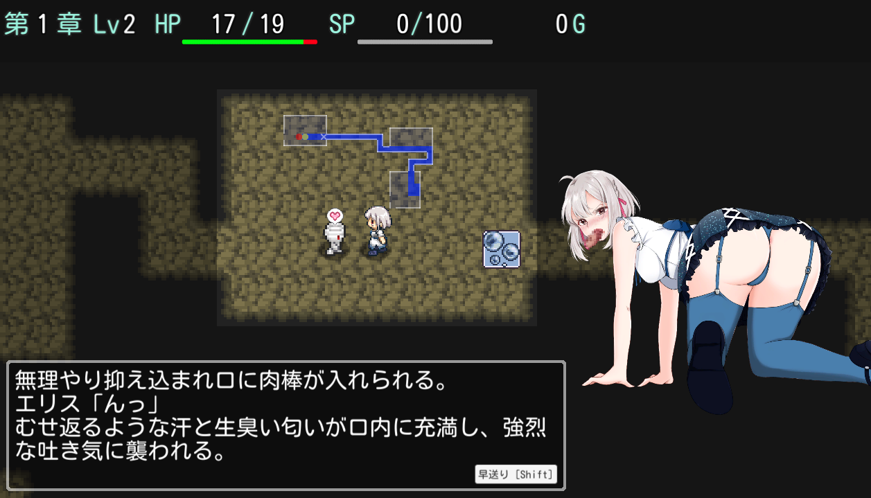 エロ部分はモンスターに押し倒されるという要素が合ってそれによってフェラさせられたりと淫乱度(SP)が上げられてイカされるとバッドステータスがつく仕様でした。