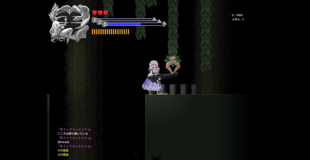 ふたなりなので自分のチンコと連結されたガトリングガンを使って敵を倒しつつ探索をしていきます。